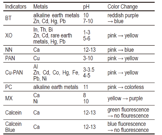 EDTA與各種金屬離子在螯合滴定中形成穩定的絡合物。EDTA溶液的總消耗量表示樣品溶液中所含混合金屬離子的總量。要確定樣品溶液中某一特定金屬離子的量,掩蔽試劑應添加以去除其他金屬離子。表 2 顯示了用于螯合和比色法的常用掩蔽試劑。