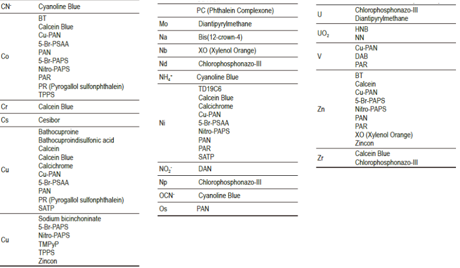 比色螯合劑在 pH 值控制的溶液中與金屬離子形成有色絡合物,其選擇性取決于金屬離子的解離常數,其靈敏度取決于絡合物的摩爾吸光率,絡合物的最大波長也是影響選擇性的重要因素例如Nitroso-PSAP與幾種重金屬離子形成絡合物,但Nitroso-PSAP-Fe絡合物的最大波長明顯長于其他金屬絡合物,因此可以在不受其他干擾的情況下測定鐵。金屬離子。水溶性比色螯合劑無需溶劑萃取即可測定水溶液中的金屬離子。因此,這些試劑可用于自動檢測系統。 e 是活細胞中信號轉導最重要的金屬離子。有幾種獨特的試劑可用于監測活細胞中的鈣濃度。