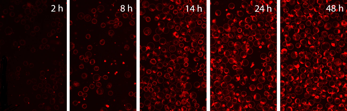 BODIPY TR Ceramide 應(yīng)用于小鼠原代脾細(xì)胞 48 小時(shí)。染料直接添加到介質(zhì)中,應(yīng)用染料后 2 小時(shí)、8 小時(shí)、14 小時(shí)、24 小時(shí)和 48 小時(shí)拍攝圖像。